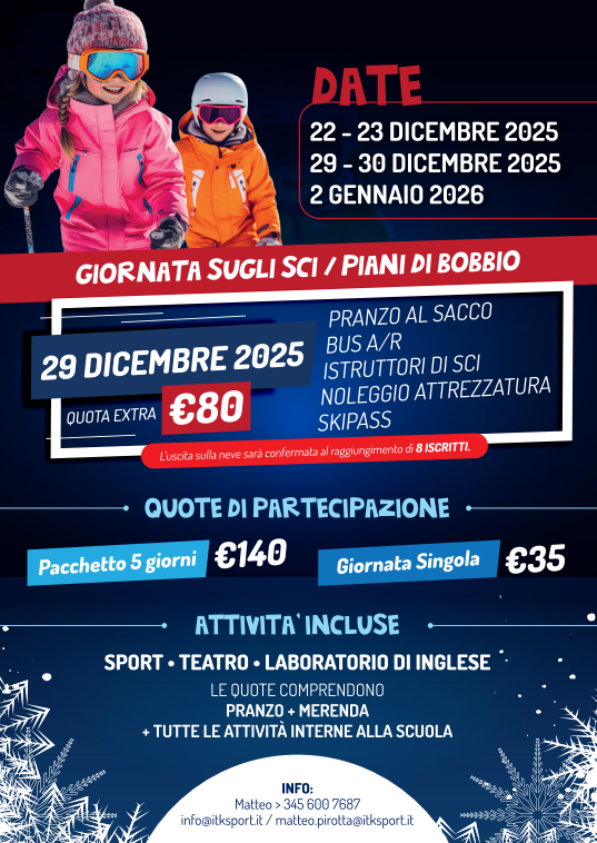 • Giornata sugli sci€80 (include trasporto, noleggio attrezzatura, istruttori, pranzo e merenda)